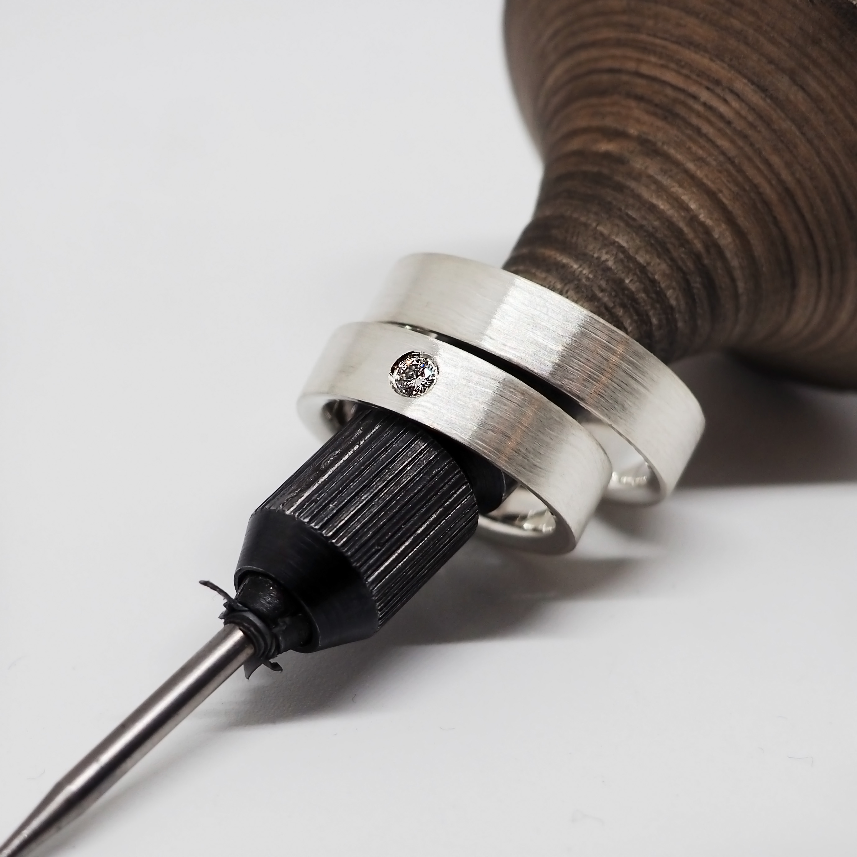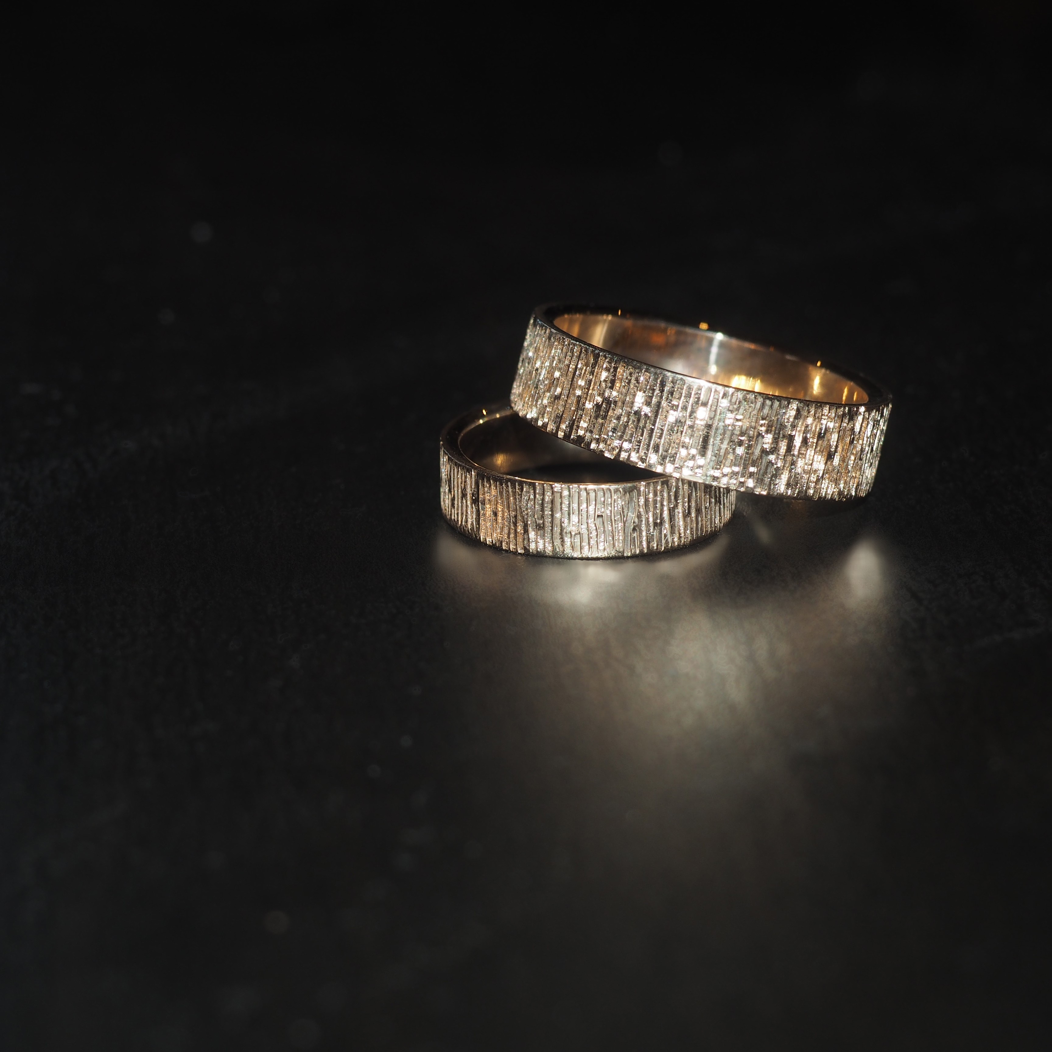 Финальный этап изготовления обручальных колец, поверхности придается желаемая вами текстура: от грубого мата до зеркального глянца